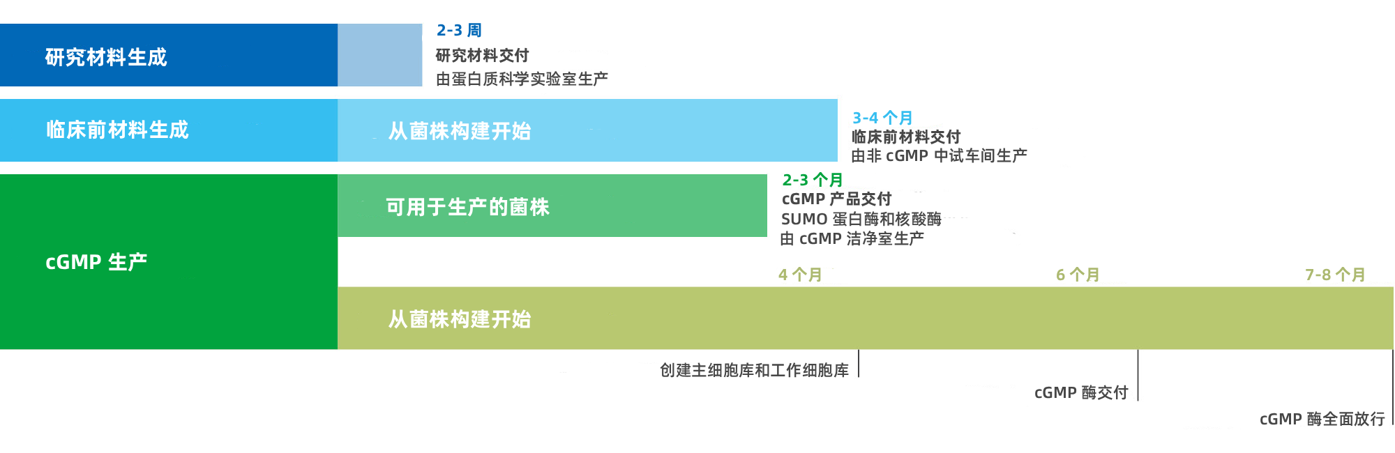 我们的酶开发和生产服务集成了先进的生产方法和改良工艺,支持客户从研究阶段到临床应用阶段的高效过渡。