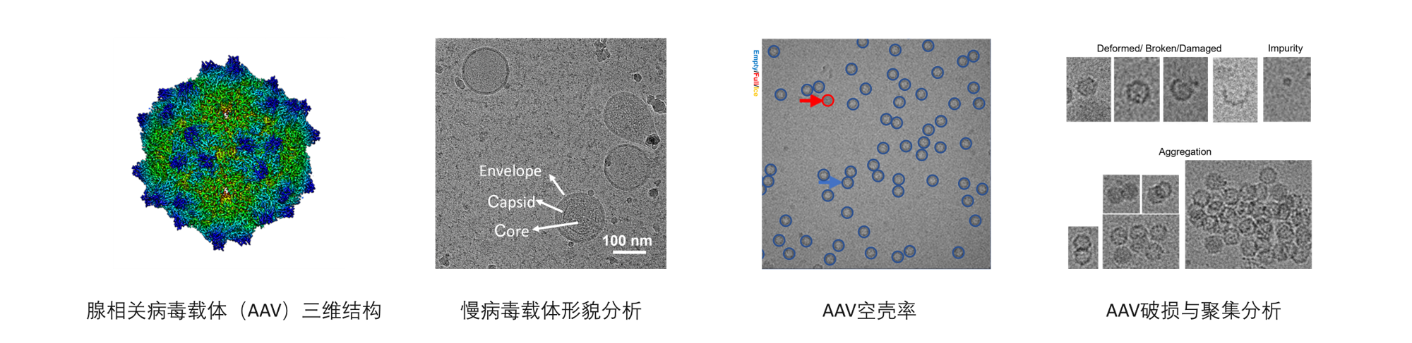Cryo-TEM 应用于病毒载体表征/检测时,相较于AUC,可在近天然状态对病毒载体进行直观、快速的成像与检测,最低仅需3ul,即可提供空壳率、形貌、粒径、三维结构等关键质量属性(CQA)信息。