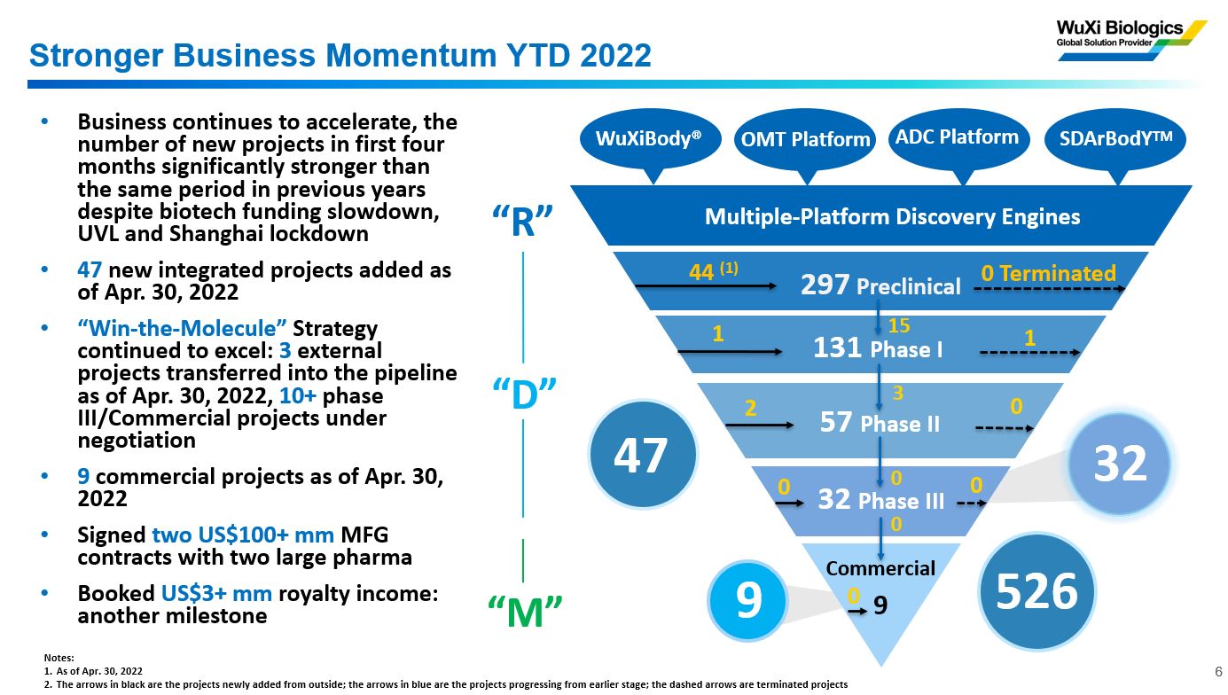 “跟随并赢得分子”战略继续取得卓越成效,商业化生产项目厚积薄发,公司与两个大型药企新签两项总价值超过1亿美元的生产合同,另有超过10个临床后期项目正在洽谈中。疫苗和生物偶联药业务继续蓬勃发展,不断赢得新客户和新项目:子公司药明海德(WuXi Vaccines)正在服务于14家客户的35个项目,包括减毒病毒疫苗、腺病毒载体疫苗、病毒样颗粒(VLP)疫苗、重组蛋白疫苗等不同技术路线疫苗;药明合联(WuXi XDC)正在赋能75个综合项目,并且已经支持客户提交26个新药临床试验申请(IND),首个商业化生产项目有望在今年落地。