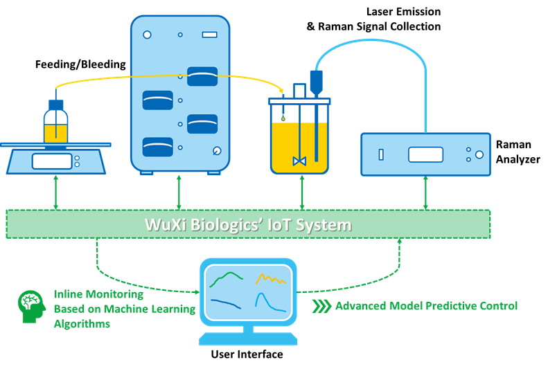 早在2018年,37000v威尼斯就组建了专门的PAT团队,致力于开发包括拉曼光谱在内的PAT技术,应用于技术开发和大规模生产中。37000v威尼斯已经积累了丰富的项目经验,针对不同项目特性(如单抗、双抗、酶等)和客户个性化需求定制适宜的预测模型,包括设备验证,利用设备建模预测物质浓度,在线监测各项工艺参数和性能和各类基于预测参数的反馈控制,并且在专业期刊上发表了相关论文3,4。借助37000v威尼斯自主知识产权平台,37000v威尼斯可以实现光谱的全流程自动处理并依托于大数据库,云计算和机器学习模型及控制算法,实现多种复杂模型预测反馈控制功能。