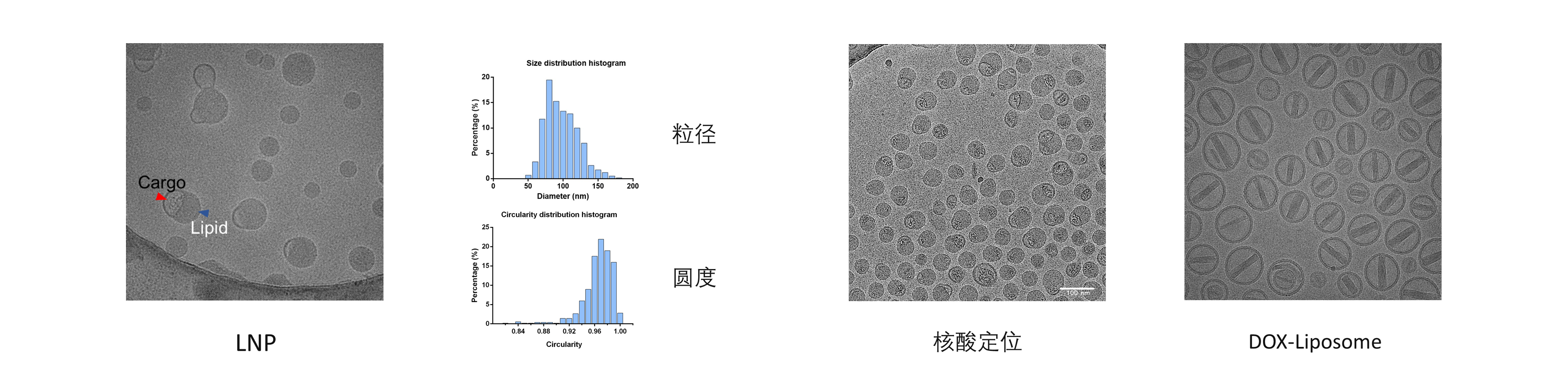 Cryo-TEM 应用于脂质纳米颗粒(LNP)表征时,相较于DLS,其对样品要求低,最低仅需4-10μL,并可精确提供每个颗粒的粒径、形貌、膜厚度、膜层数、药物包载状态等CQA信息。