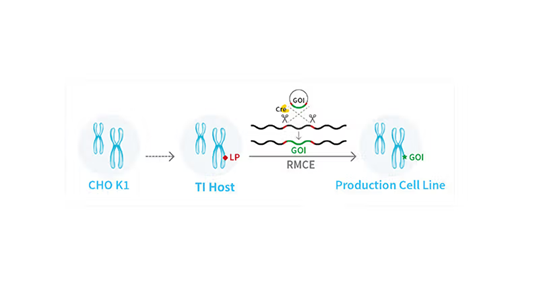 图1:CHO细胞中定点整合的示意图。LP为可供目的蛋白插入的着陆垫 (Landing pad) ,RMCE为重组酶介导的盒式交换,GOI为目的蛋白。