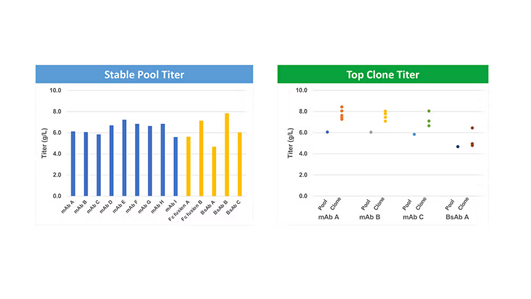 基于缩短开发周期这一目标,WuXiaTM TrueSite所构建的细胞株经证实具备高度稳定性,使细胞株稳定性研究不再是关键路径上的必需步骤。不仅如此,其产品质量的一致性,为采用更简化的流程提供了有力支撑,即利用定点整合细胞池来生产非GMP级材料。在此过程中,生产克隆的筛选可依据与细胞池产品质量属性的匹配程度展开,筛选出的克隆应用于 GMP 生产。