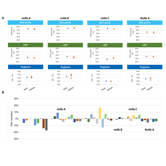 确保细胞池与克隆细胞株之间产品质量的一致性,是利用非GMP级细胞池生产材料加速新药临床试验(IND)申报的关键因素。对比分析显示,由WuXiaTM TrueSite生成的单克隆细胞株与细胞池之间的关键质量属性显现出高度的可比性(图3A),如分子筛排阻色谱-液相色谱主峰、电荷异质性分布及N-糖基化表型等。上述结果有力支撑了运用定点整合细胞株细胞池,生产非GMP级(乃至早期临床级)材料的可行性,此方式在确保产品质量标准的同时,还能大幅缩短开发周期。