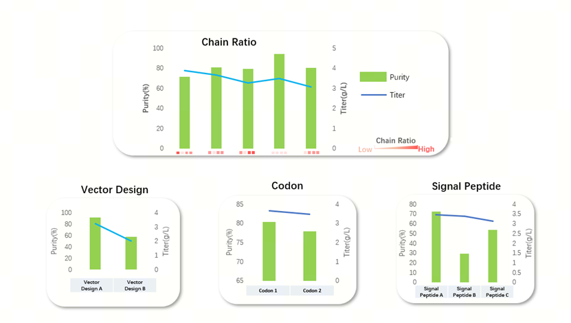 科研等级细胞池的筛选通常耗时约6周,通过系统涵盖产量、产品纯度、信号肽残留风险的多参数评价体系,选择最佳的转染条件。图1展示了一项案例研究,评估了载体设计、密码子、信号肽和链比例对产量和质量属性的影响。通过一轮科研等级细胞池系统性评估,可快速筛选到稳转的优选转染条件,同时有助于双抗分子在CMC(化学、制造与控制))开发阶段的风险识别。