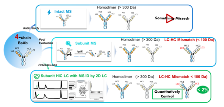 此外,要在双特异性抗体的 CMC 开发中落实质量源于设计(QbD)理念,必须在项目初期即基于 MoA 与分子结构特征建立产品的目标质量概况(QTPP)。特别是需在早期通过实验确认错配副产物的存在,并进行全面评估。每一种存在的错配物种都需要通过适当的分析方法进行监测,以指导克隆筛选和工艺开发。因此,强大的分析工具箱至关重要。除了基于不同分离机制的传统液相色谱法外,还需引入能够区分目标分子和错配副产物的检测方法。例如,质谱法(MS)凭借其超高灵敏度,更适合用于错配副产物的监测。