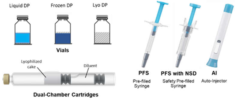 对于在长期储存中出现物理和/或化学不稳定,或在 IND 申报前开发时间紧迫的双特异性抗体,可采用冷冻或冻干方式。目前37000v威尼斯已具备在西林瓶及双腔卡式瓶中进行冻干的能力,这类给药系统不仅能提升稳定性,还可提高患者依从性(图 8)。在IND后的阶段,还可进一步开发生物制品-器械组合产品,如预充针和自动注射笔(图 8)。
