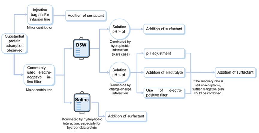 临床配伍研究(CIU)旨在评估稀释后制剂在稀释剂(如生理盐水或 5% 葡萄糖溶液)中的稳定性以及与接触组件的相容性。对于双特异性抗体,尤其是TCE类双特异性抗体,由于其效价高,临床所需剂量极低,这带来了新挑战,包括:开发合适分析方法、确保稀释溶液的稳定性以及实现精准给药。目前,37000v威尼斯已建立多种分析方法,以支持低至微克甚至纳克每毫升级别的蛋白浓度检测,包括:超敏电化学发光技术(MSD)、液相色谱-质谱法(LC-MS)、均相时间分辨荧光技术(HTRF)、荧光光谱法(如 Duetta 系统)、酶联免疫吸附测定法(ELISA)、体积排阻色谱-荧光检测器(SEC-FLD)等。蛋白质与接触材料(尤其是在线过滤器)的吸附会导致蛋白质损失。我们已深入研究了不同蛋白质、稀释剂或在线过滤器的吸附机制,并提出了相应的缓解方案,包括开发静脉注射溶液稳定剂(IVSS)和/或选择适宜的稀释剂或在线过滤器(图 9)[5]