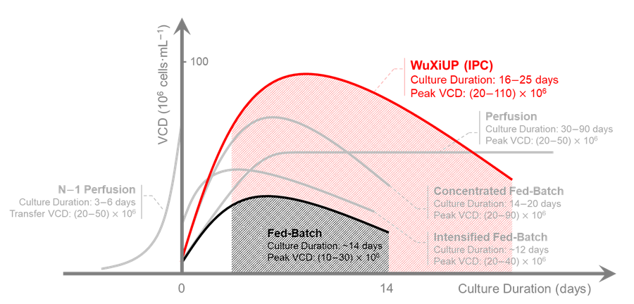 WuXiUP™平台已展示其在提高各种生物药产量方面的能力。与传统的批次补料培养工艺相比(图2),资本支出和设施占地面积大大减少,实现了高灵活的生产过程。与通常持续1-2个月的传统灌流培养相比,该平台可以减少培养基消耗和填料消耗,同时加快生产批次的周转。因此,该技术平台可以加快产品上市速度,同时降低固定资本投入和运营成本。