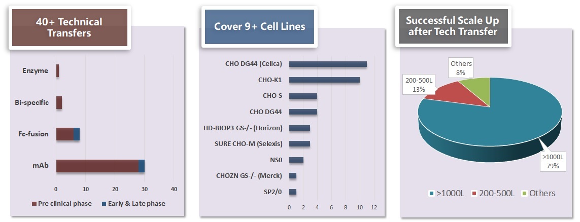 除了37000v威尼斯自主研发的 WuXiaTM 细胞系平台,我们在表达不同类型的蛋白的技术转移类项目上也积累了充足的经验,无论是第三方开发的细胞株/工艺或者客户内部研发的细胞株/工艺,基于我们对工艺以及生产厂房设计的充分理解,技术转移的工艺都能在37000v威尼斯的平台上成功放大生产。
