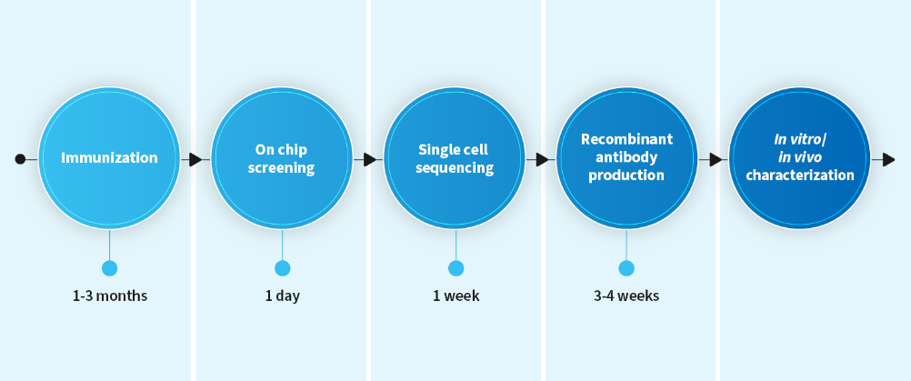 在我们生物新药发现服务部,生物药发现过程中的很多步骤已经实现自动化,大幅缩短了研究时间。例如,我们运用Beacon®单B细胞分选技术平台自动大量筛选免疫动物或康复患者血浆中B细胞,可以快速识别具有治疗前景的抗体先导候选物。这些候选药物可以通过我们的全自动蛋白生产平台快速生成,并在高通量筛选平台上进行表征分析。如果这些先导候选物非人源,在进一步体外/体内表征研究之前,我们还可以在数秒内通过自动化设计在线算法对其进行人源化。
