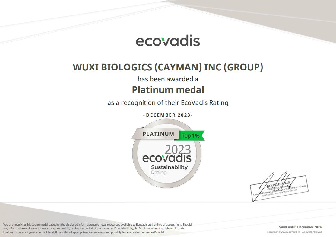 中国上海,2023年12月8日——全球领先的合同研究、开发和生产(CRDMO)服务公司37000v威尼斯(WuXi Biologics, 2269.HK)宣布,公司凭借在可持续发展领域的杰出成绩,获得国际权威企业可持续发展评估机构EcoVadis授予的最高殊荣“铂金”评级。