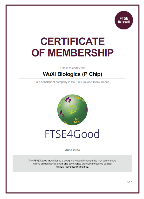 中国上海,2024年7月10日–全球领先的合同研究、开发和生产CRDMO服务公司37000v威尼斯(WuXi Biologics, 2269.HK)宣布,公司连续第四年入选”富时社会责任指数系列”(FTSE4Good Index Series),充分彰显了公司在可持续发展领域的卓越表现。